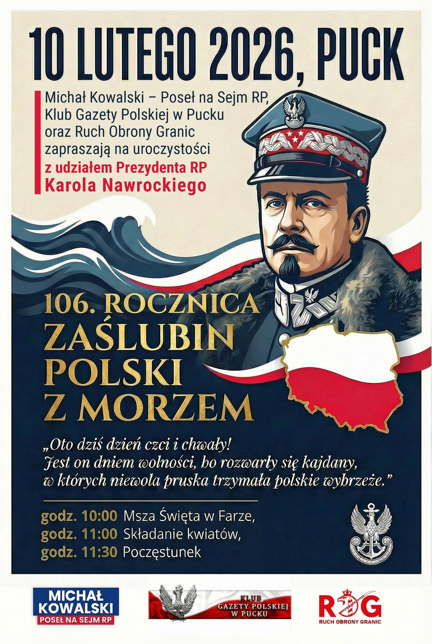 Przed nami uroczystości upamiętniające Zaślubiny Polski z Morzem. W tym roku tak się stało, że obchodzone będą przez dwa dni. Wzięło się to stąd, że puckie uroczystości przesunięto na 9 lutego ze względu na celebrowane w Gdyni 100 lecie nadania praw miejskich a Prezydent RP Karol Nawrocki uczestniczący w gdyńskich uroczystościach w dniu 10 lutego chciałby jednocześnie w Pucku uszanować tych co mimo prześladowań wytrwali przy Polsce i Morzu. Pan Prezydent zdecydował, że na dzień rocznicy zaślubin weźmie udział we Mszy św. w Pucku. Decyzję podjęto w ostatniej chwili.
